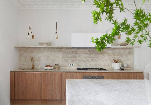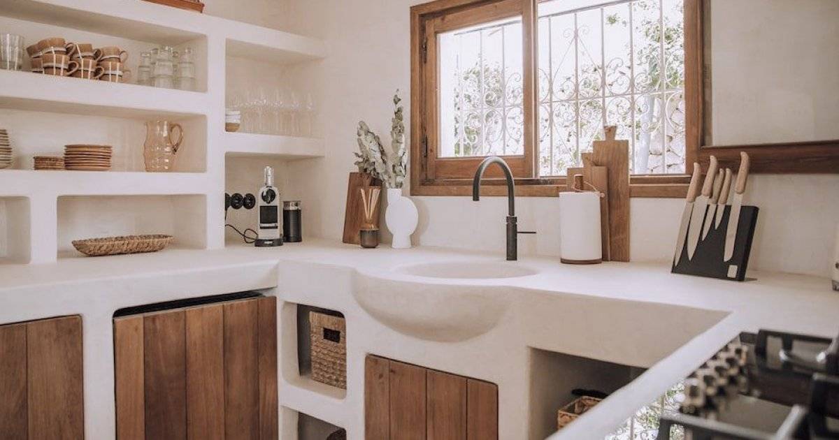 Les codes d'une cuisine contemporaine au style méditerranéen sont des façades claires ou des tons pastels (bleu, craie), les beiges, des plans de travail en pierre naturelle, du bâti ou des jambages. Une touche végétale dans la décoration de la pièce sur les murs qui nous rappelle le sud.