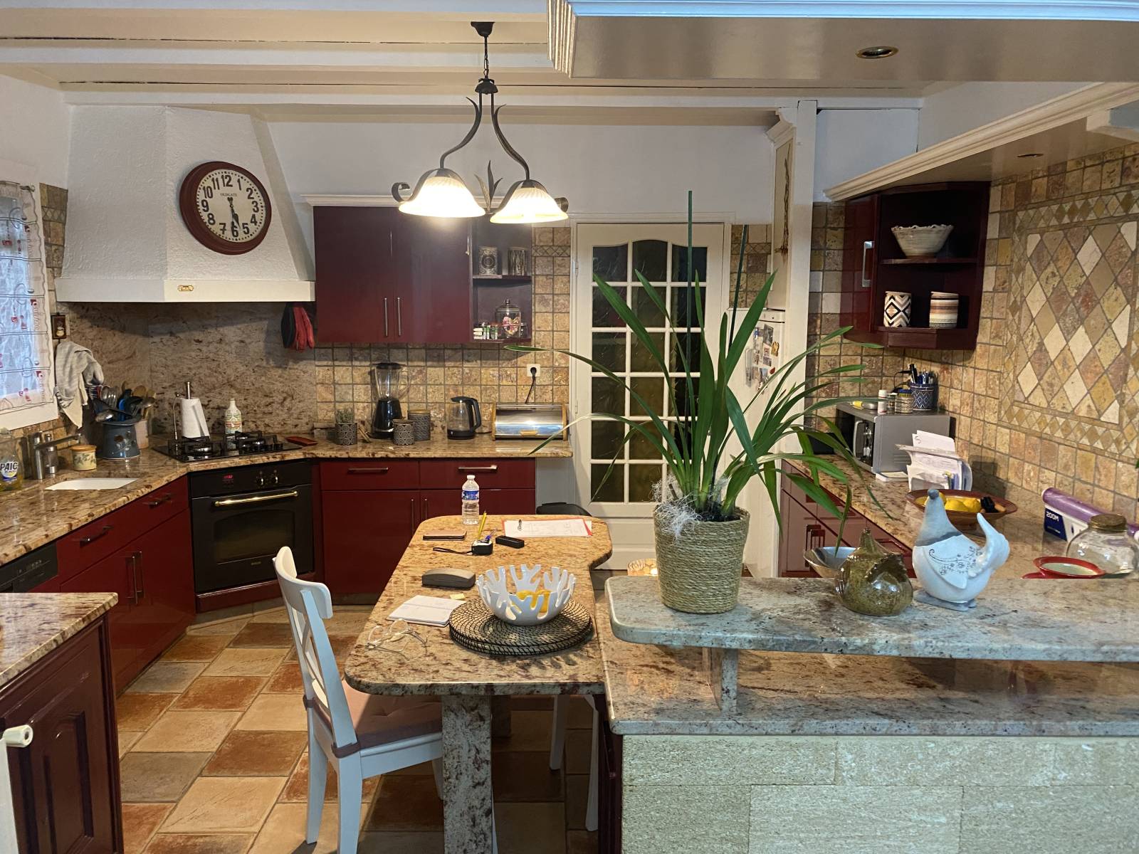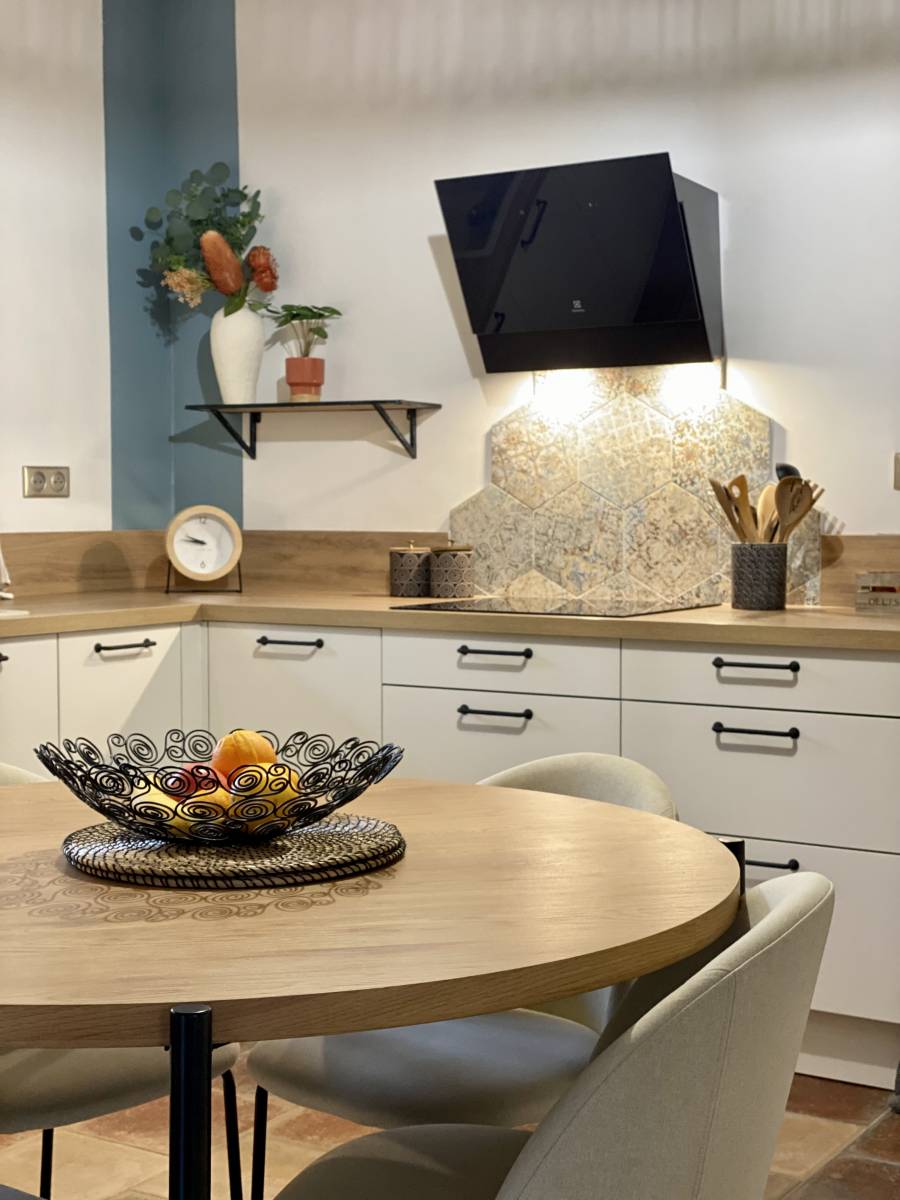 Le résultat est une cuisine contemporaine et chaleureuse, pensée pour le quotidien : table centrale en bois, crédence en carreaux géométriques, rangements bas optimisés, et touches décoratives pour un intérieur unique.